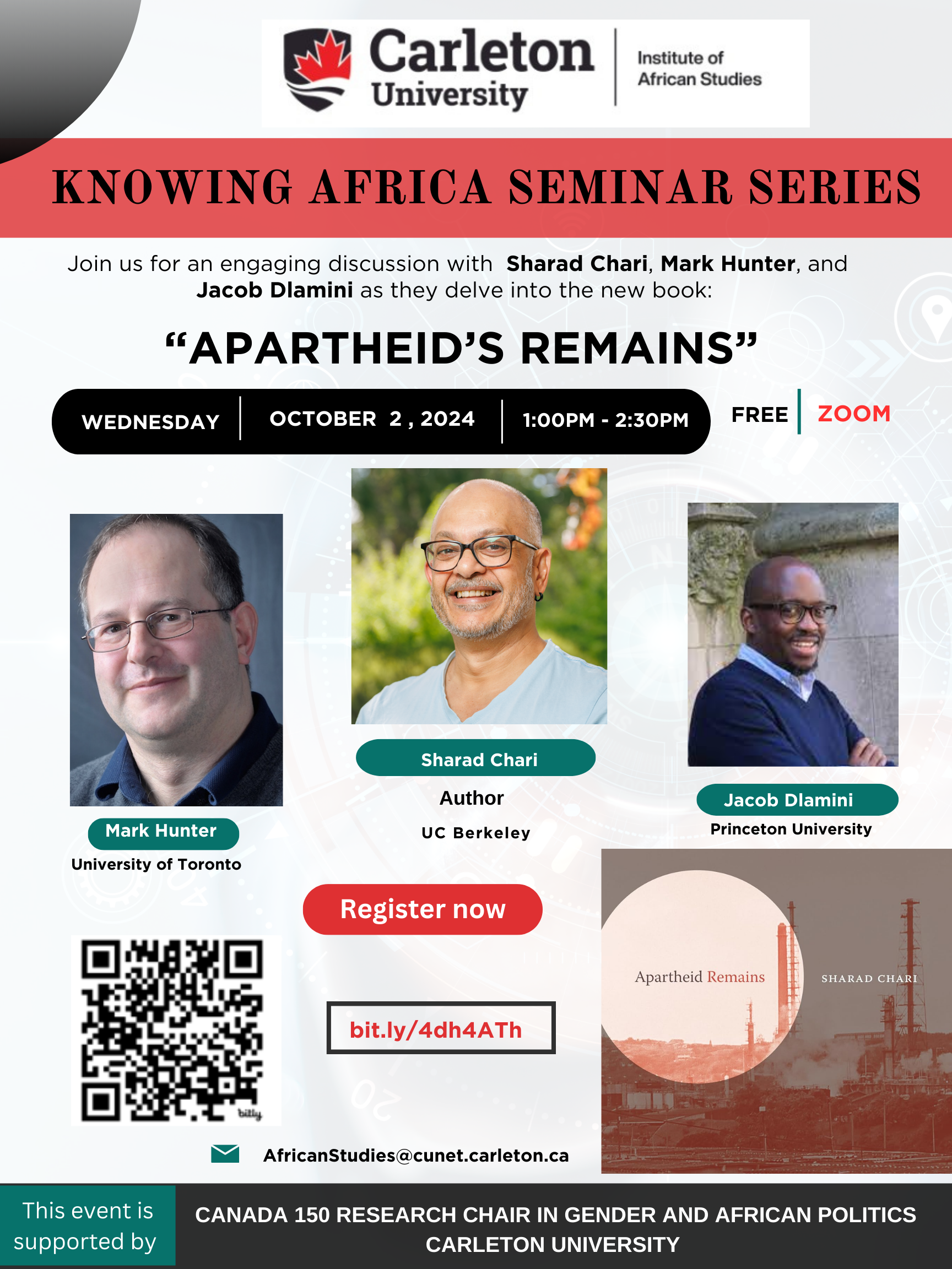 We are pleased to invite you to the “Knowing Africa” Seminar Series titled “Apartheid’s Remains“, featuring a presentation by Sharad Chari (Berkeley), with discussants Mark Hunter (University of Toronto) and Jacob Dlamini (Princeton).