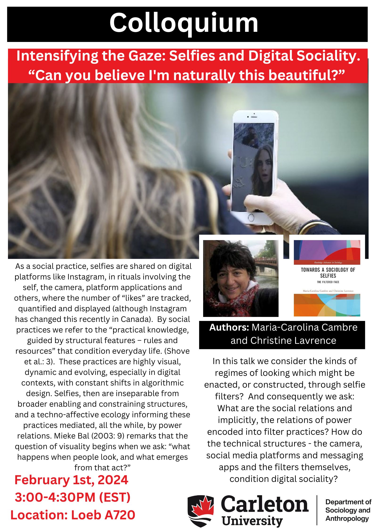 As part of the Department of Sociology and Anthropology Colloquium Series, Maria-Carolina Cambre presents: Intensifying the Gaze: Selfies and Digital Sociality. “Can you believe I’m naturally this beautiful?”