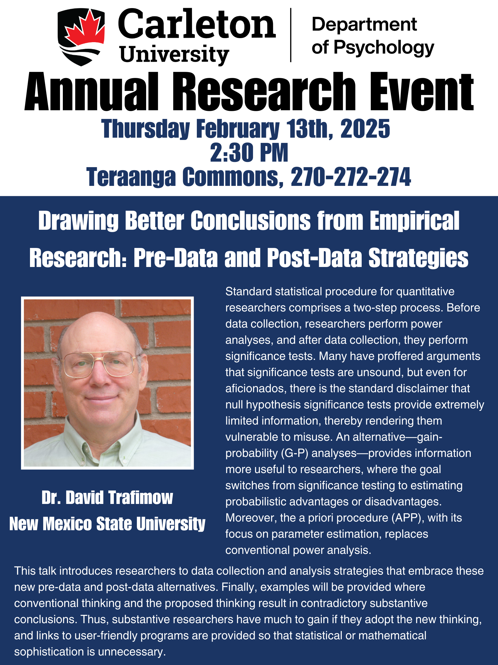 On Thursday February 13th, 2025 the Department of Psychology will host it’s Annual Research Event! We will be joined by Dr. David Trafimow from New Mexico State University. Dr. Trafimow will be presenting a talk titled, ‘Drawing Better Conclusions from Empirical Research: Pre-Data and Post-Data Strategies. The talk will be followed by a reception. If you plan to attend, please register. We hope to see you there!