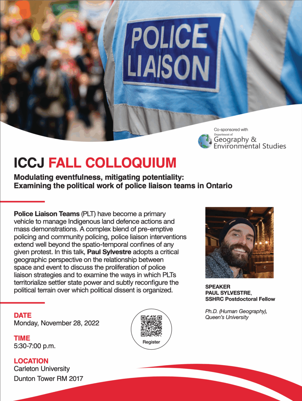 ICCJ Fall Colloquium: Modulating eventfulness, mitigating potentiality: Examining the political work of police liaison teams in Ontario