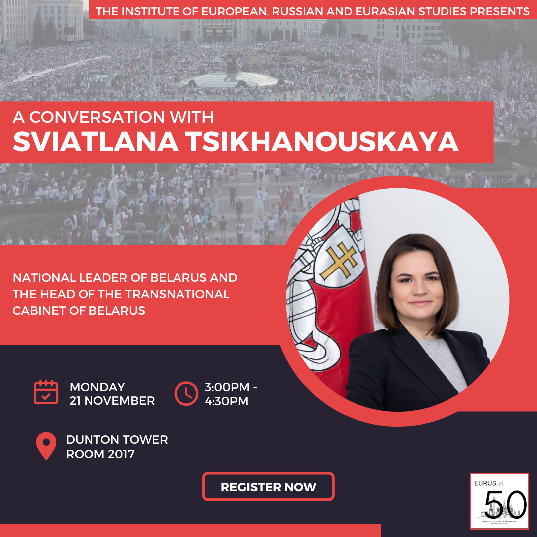 Join us for a conversation with Sviatlana Tsikhanouskaya, National Leader of Belarus and the Head of the United Transitional Cabinet of Belarus. This event is organized by the Institute of European, Russian and Eurasian Studies at Carleton University.