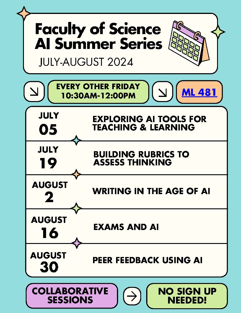 The Faculty of Science is hosting an AI Summer Series throughout July and August. Every other Friday sessions will be held in ML 481 from 10-30am-12:00pm and facilitators will be digging into a different topic concerning the use of Artificial Intelligence in the classroom. These sessions will be collaborative with the goal of leaving you with real world applications for your new found knowledge.