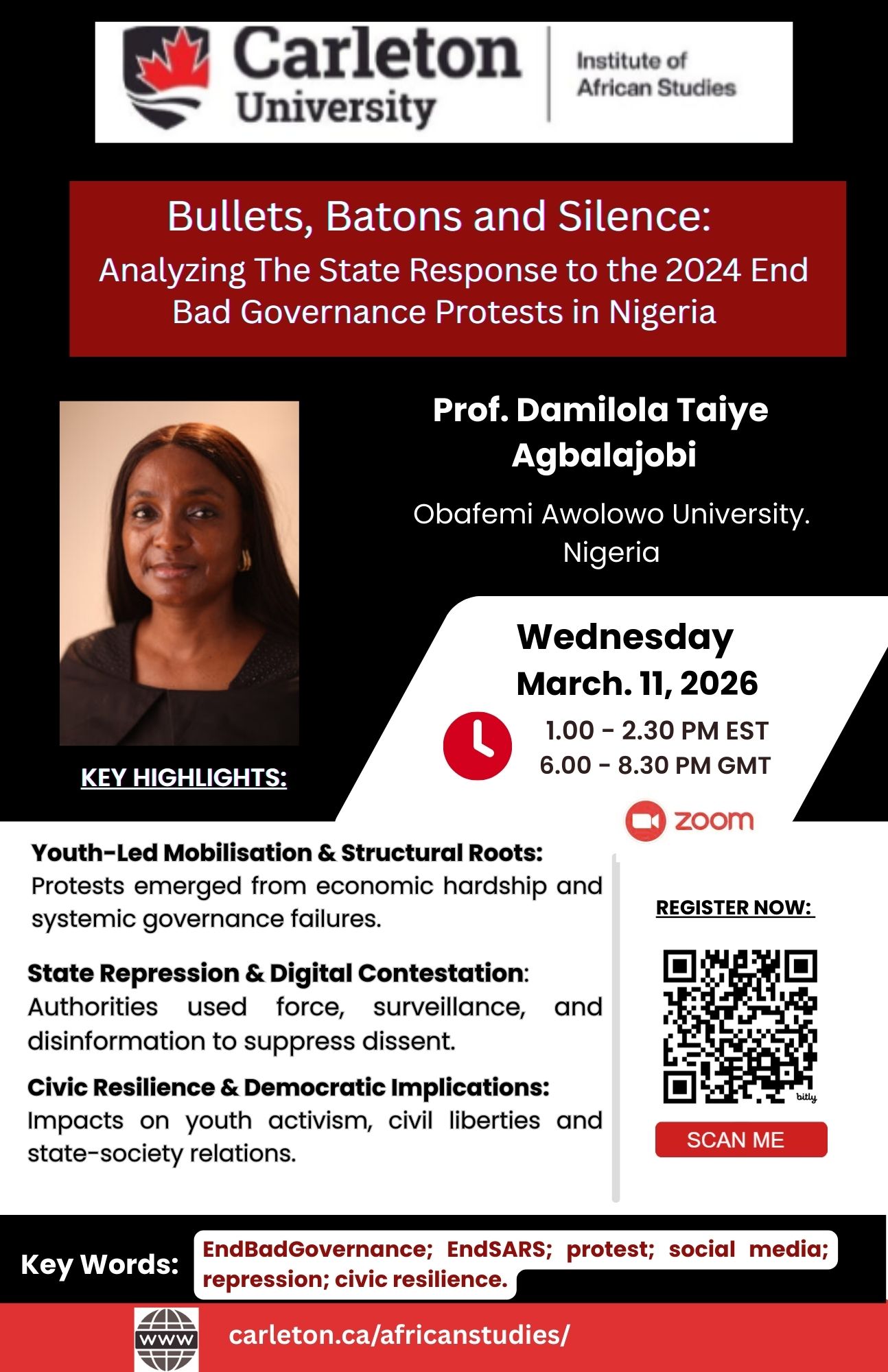 Join us for the Brownbag Seminar entitled “Bullets, Batons and Silence: Analyzing The State Response to the 2024 End Bad Governance Protests in Nigeria” by Dr.Damilola Taiye Agbalajobi, Professor of Political Science, Department of Political Science, Obafemi Awolowo University.