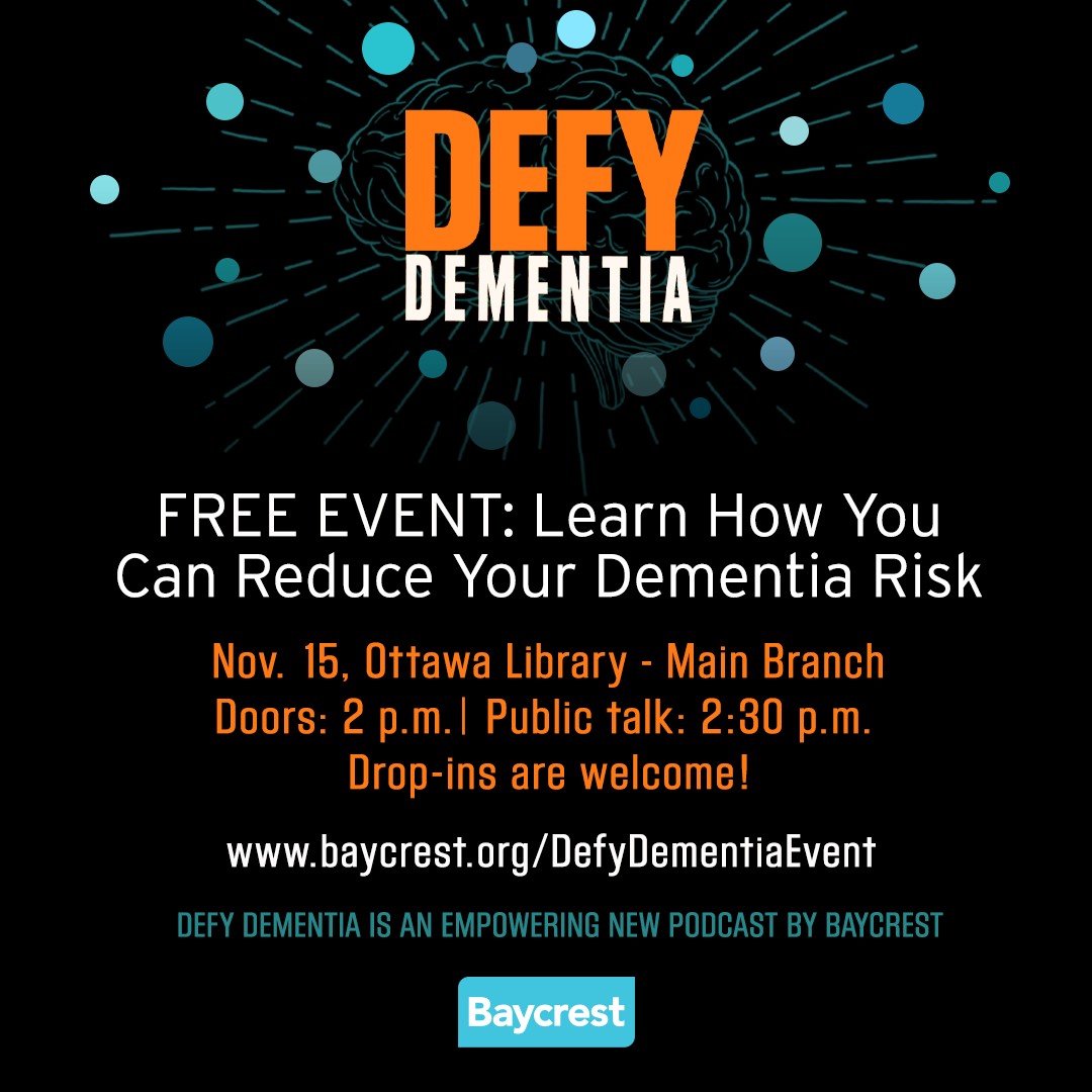 Do you want to learn how to safeguard your brain health as you age? Join us for an inspiring, interactive event filled with actionable tips, hosted by Baycrest and Defy Dementia’s Jay Ingram and Dr. Allison Sekuler. The event will take place at the Ottawa Library – Main Branch on November 15. Doors open at 2 p.m. (panel discussion to start at 2:30 p.m.) – drop in any time! Light refreshments will be provided. For more details and to register, visit www.baycrest.org/defydementiaevent
