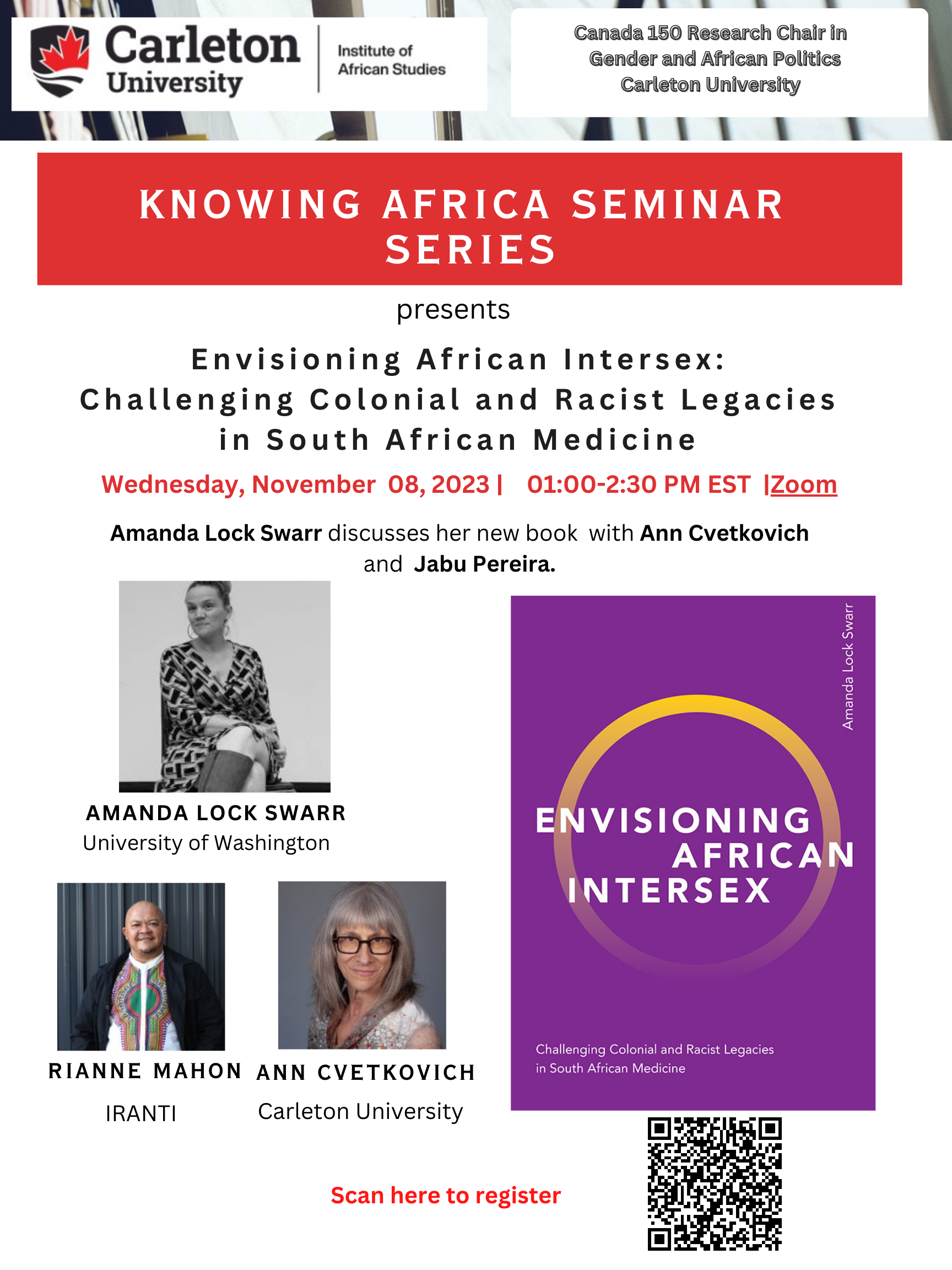 Kindly join us for the presentation of a new book titled ” Envisioning African Intersex: Challenging Colonial and Racist Legacies in South African Medicine” by Amanda Lock Swarr (Associate Professor, Gender, Women & Sexuality Studies, University of Washington) discussing her book with Ann Cvetkovich (Professor, Feminist Institute of Social Transformation, Carleton University) and Jabu Pereira ( IRANTI).