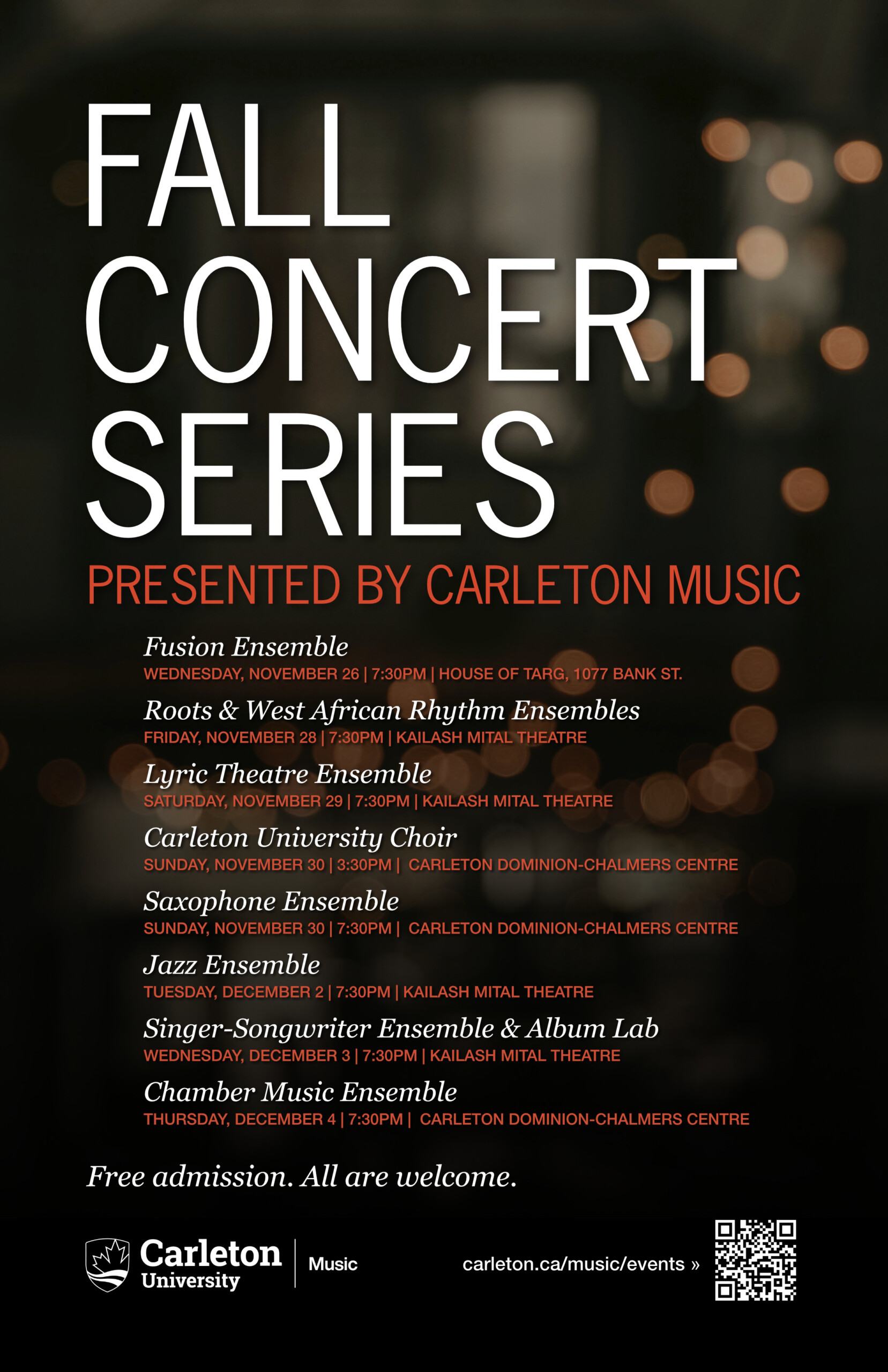 Carleton Music invites you to nine evening and daytime performances by our student ensembles at the Carleton Dominion-Chalmers Centre, Kailash Mital Theatre, and House of Targ.