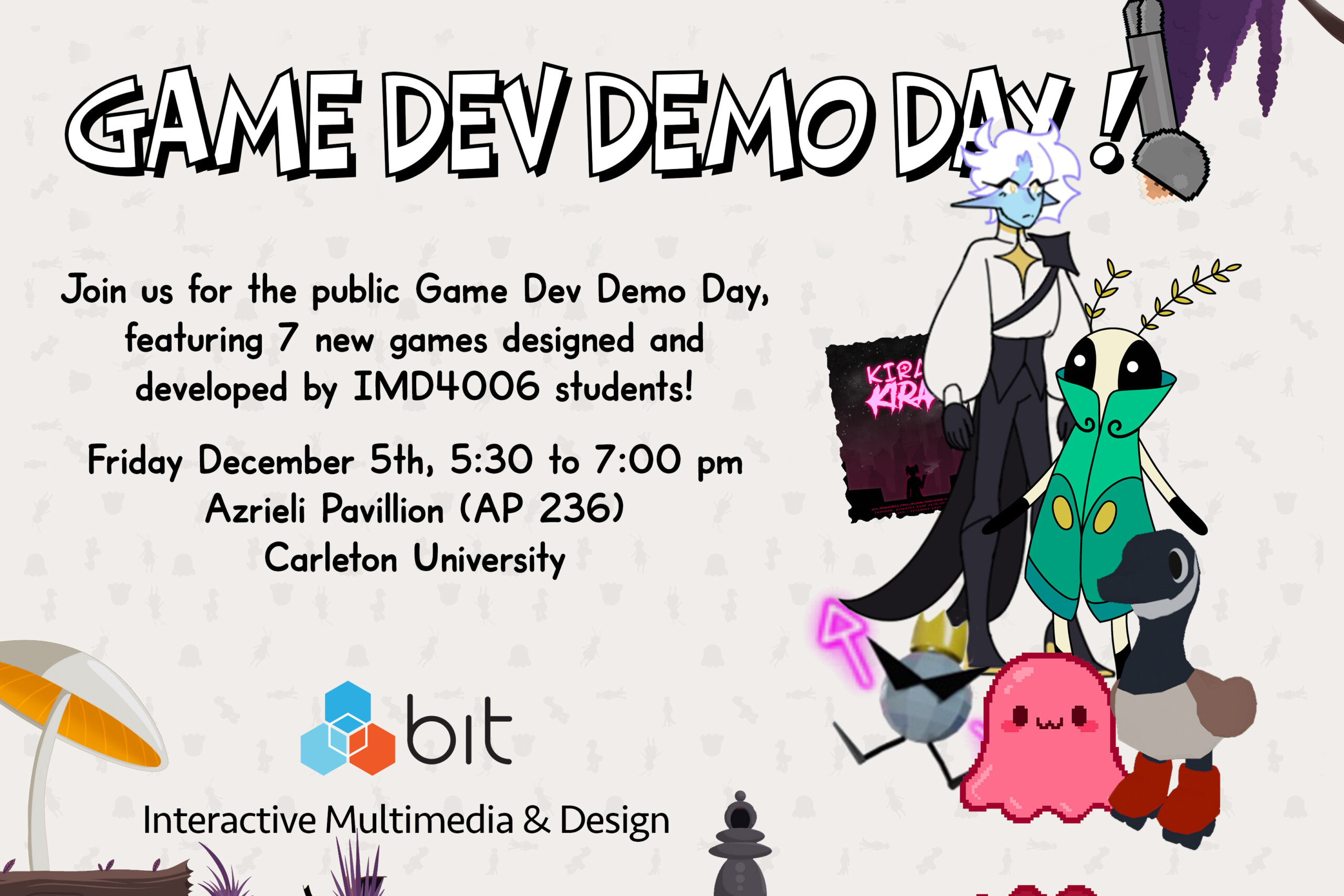 Join us for the public Game Dev Demo Day, featuring 7 new games designed and developed by IMD4006 students!