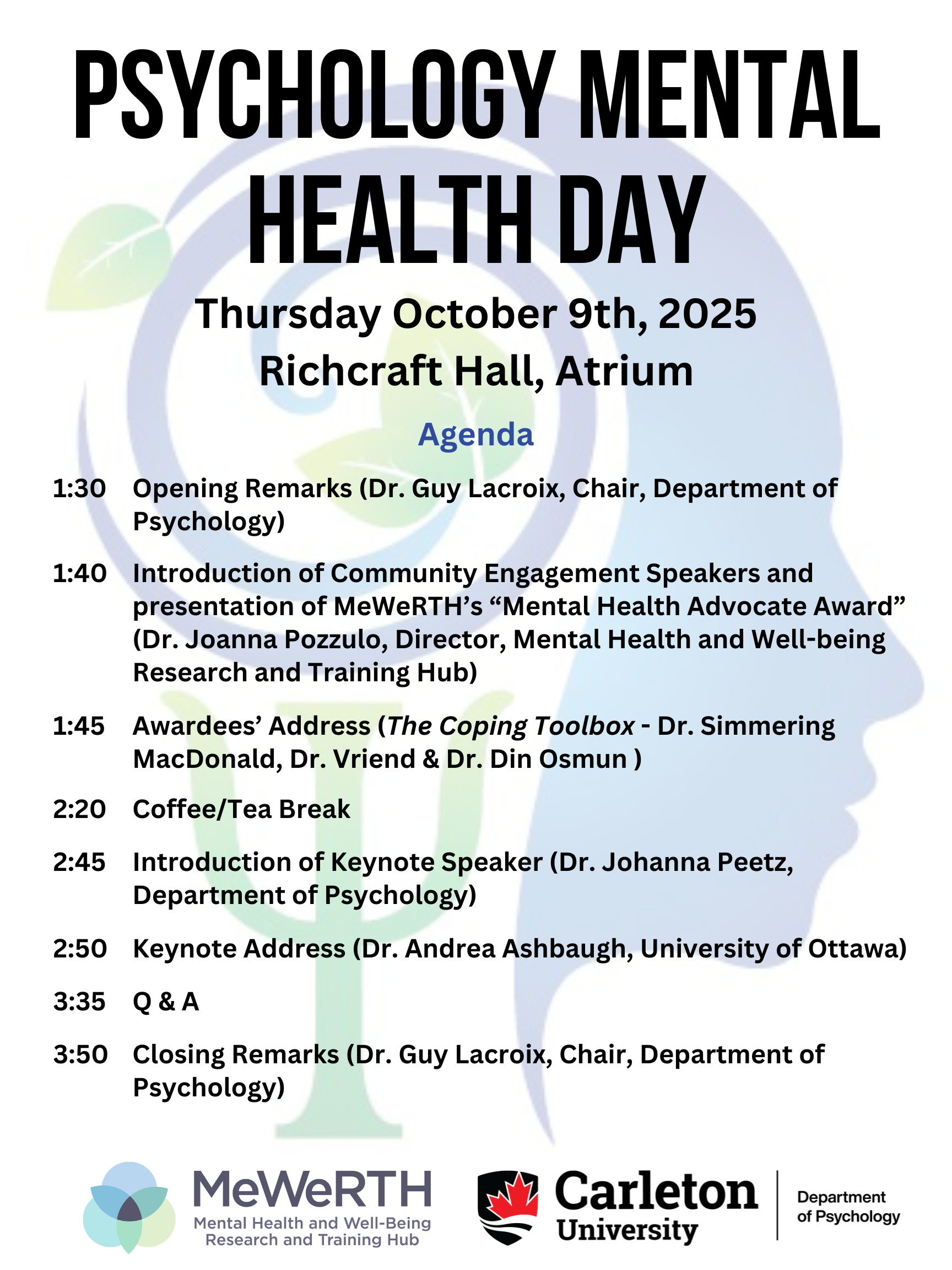The Department of Psychology in partnership with MeWeRTH, will co-host Psychology Mental Health Day on Thursday October 9th, 2025 in the Richcraft Hall, Atrium. This year the ‘Mental Health Advocate Award’ will be presented to the hosts of The Coping Toolbox Podcast, Dr. Mary Simmering MacDonald, Dr. Jennifer Vriend and Dr. Laila Din Osmun. Our keynote speaker will be Dr. Andrea Ashbaugh from the University of Ottawa.