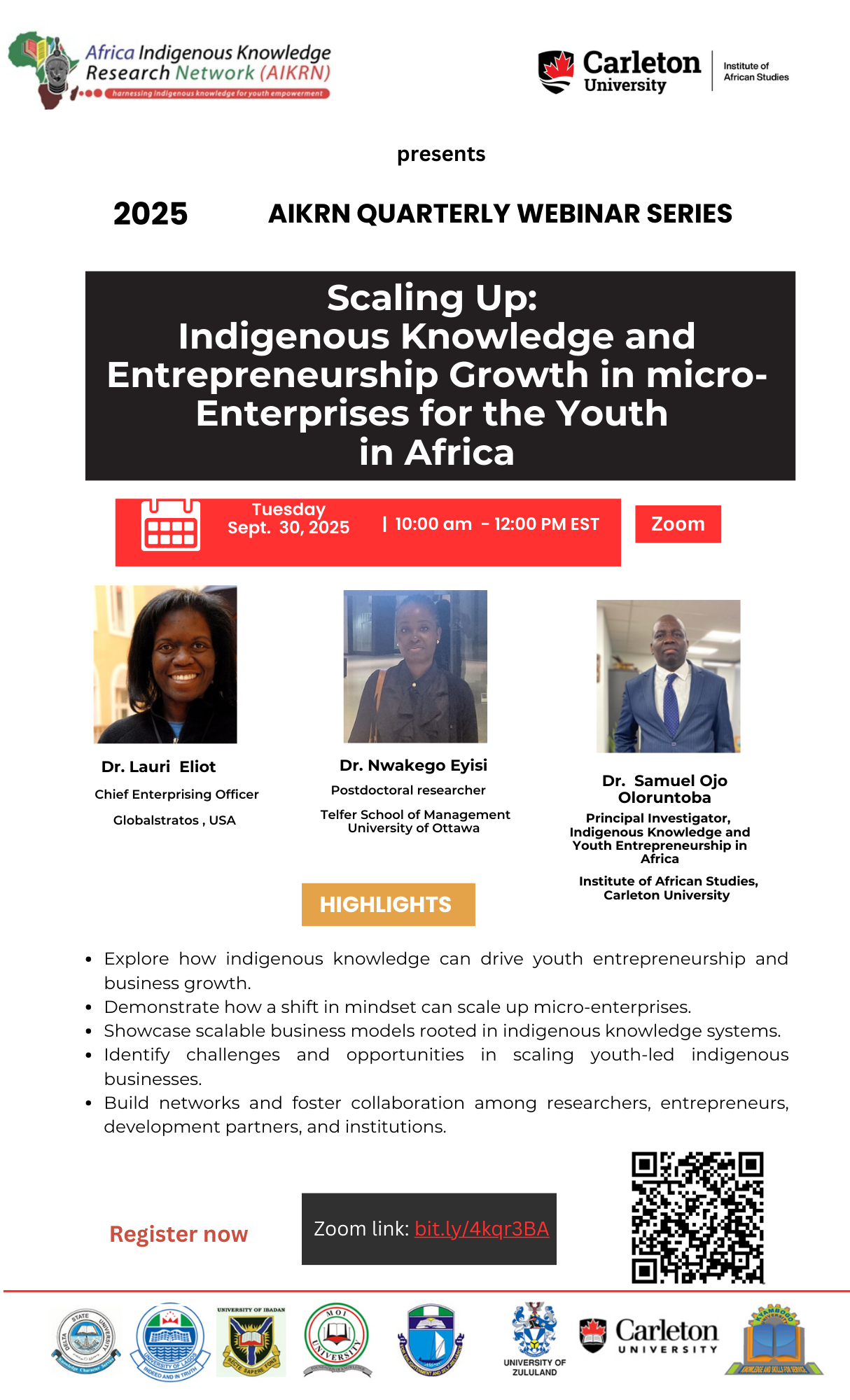 This webinar will explore how Indigenous Knowledge Systems (IKS) can drive youth entrepreneurship, foster innovation, and create sustainable livelihoods across Africa. Dr. Lauri Eliot and Dr. Nwakego Eyisi will share insights, success stories, and strategies for scaling youth-led micro-enterprises rooted in African knowledge and traditions. The discussion will be chaired by Professor Samuel Ojo Oloruntoba.