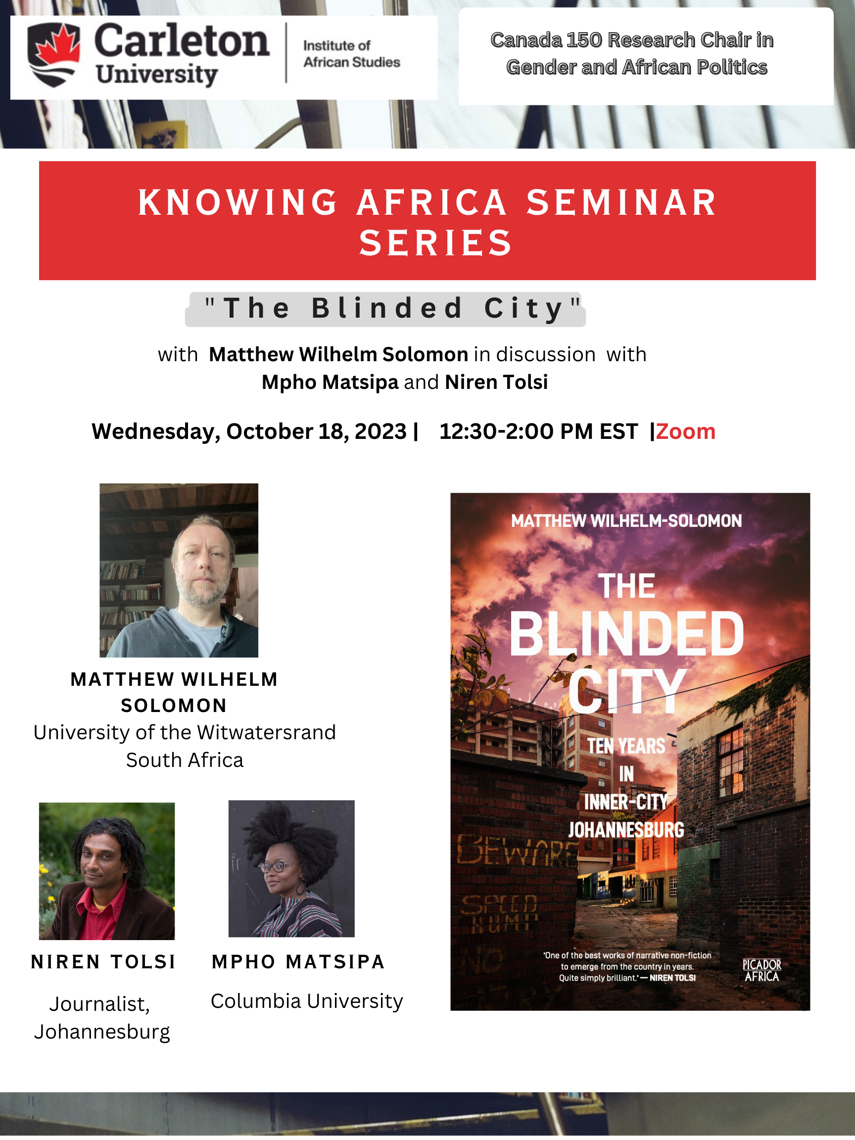 Kindly join us for the virtual presentation of a new book titled ” The Blinded City by Matthew Wilhelm Solomon discussing his book with Mpho Matsipa (Columbia University) and Niren Tolsi (journalist, Johannesburg).
