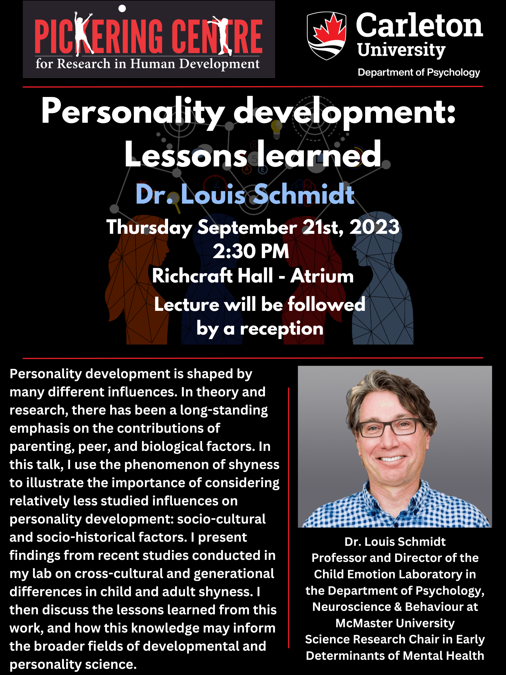 On September 21st, 2023 the Pickering Centre for Research in Human Development will be hosting a public lecture with Dr. Louis Schmidt. Dr. Schmidt’s lecture is titled, ‘Personality development: Lessons learned’ and will begin at 2:30 PM. The lecture will be followed by a reception at 4 PM. If you plan to attend, please register by September 11th, 2023.
