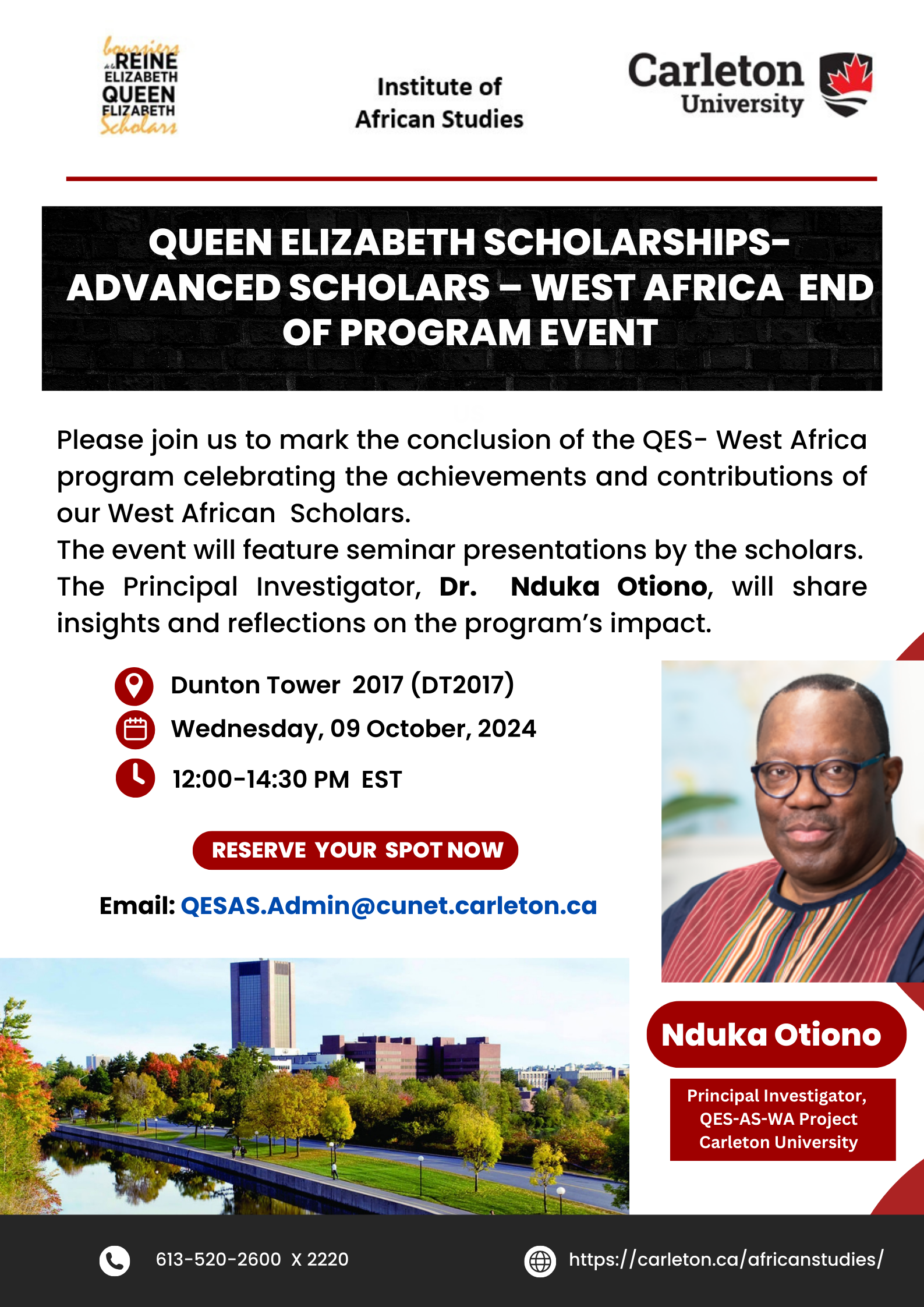 Join us for an engaging event celebrating the Queen Elizabeth Advanced Scholars – West Africa (QES-AS-WA) program! This gathering will feature presentations, discussions, and networking opportunities to foster academic and cultural exchanges between Carleton University and institutions in West Africa.