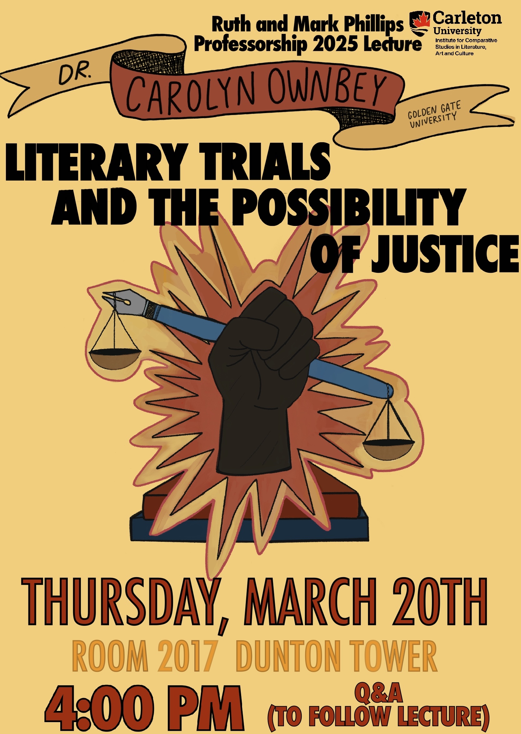 We invite you to join us Thursday, March 20th, 2025 for this year’s Ruth and Mark Phillips Professorship (RMPP) Lecture! The current holder, Dr. Philip Kaisary welcomes Dr. Carolyn Ownbey (Golden Gate University, Associate Professor, Department of English) to deliver her talk, titled “Literary Trials and the Possibility of Justice” (abstract below). The lecture begins at 4:00pm, Room 2017 Dunton Tower (Carleton University), with a Q&A to follow!