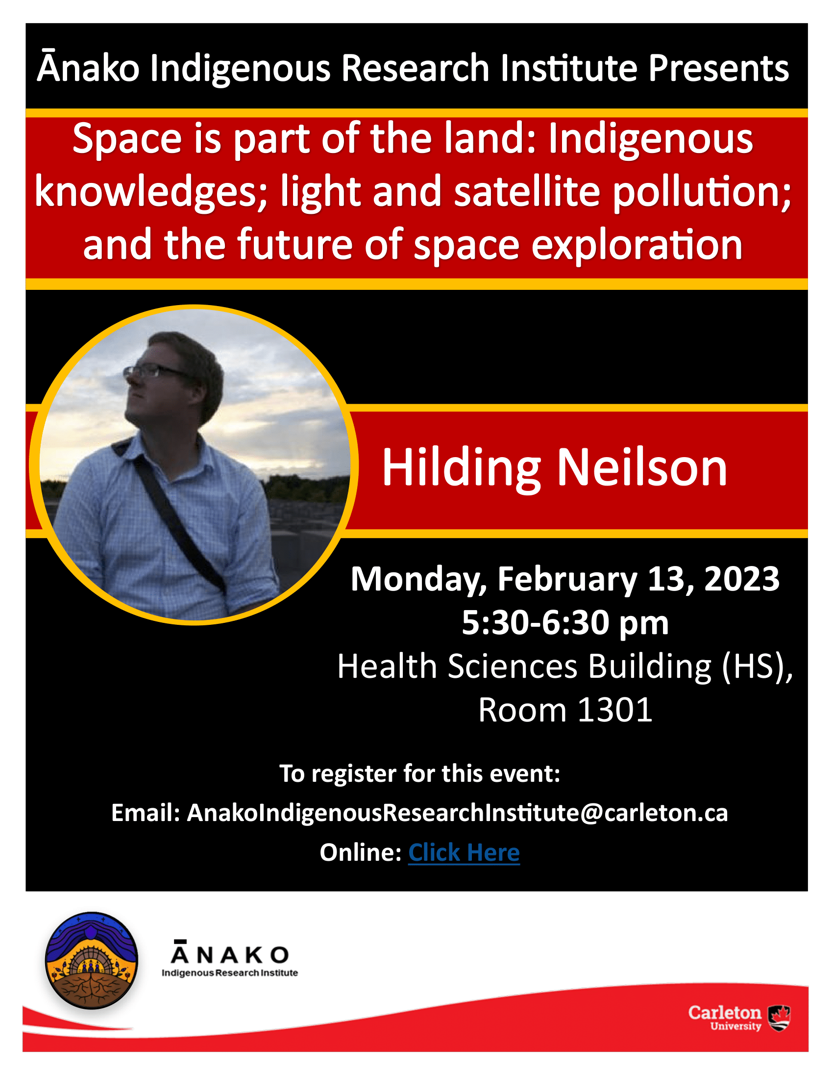 The Ānako Indigenous Research Institute and the Faculty of Science are partnering to welcome Hilding Neilson, an interdisciplinary scientist whose research explores the intersection of science, astronomy, and Indigenous knowledge. Following his lecture, Hilding will be joined by the Carleton University Physics Society (CUPS) for a follow-up discussion. The event will be held in the Health Sciences building (HS) in Room 1301.