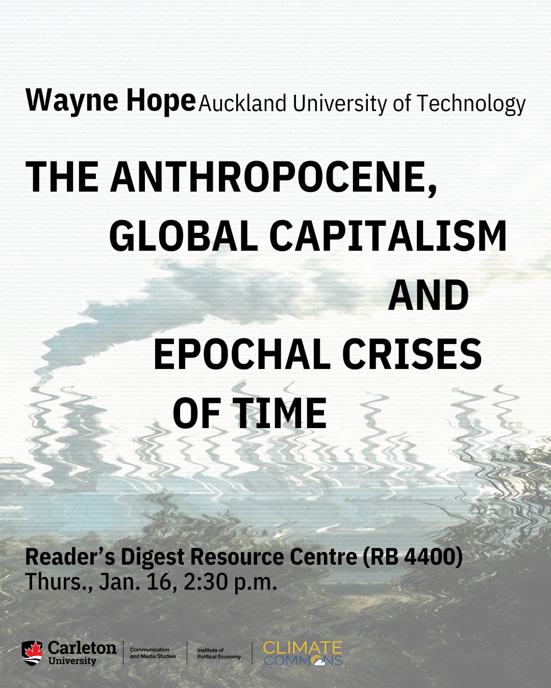 On Thursday, January 16, 2025, Communication and Media Studies, the Institute of Political Economy, and the Carleton Climate Commons are excited to welcome Professor Wayne Hope of the Auckland University of Technology for a talk based on his book “The Anthropocene, Global Capitalism and Global Futures: Times Out of Joint.” Light refreshments will be provided.