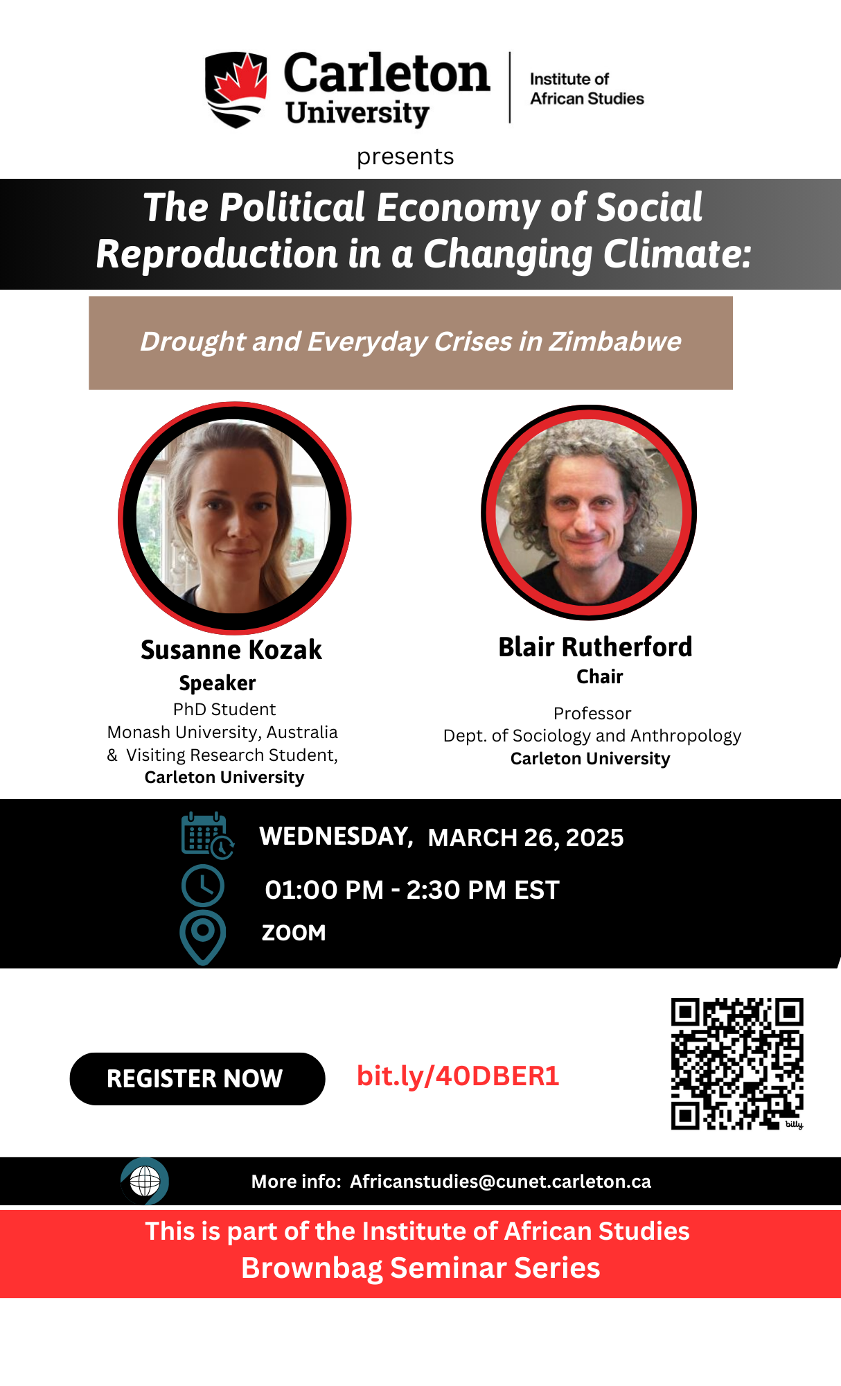 Join our Brownbag Seminar with Susanne Kozak as she presents “The Political Economy of Social Reproduction in a Changing Climate: Drought and Everyday Crises in Zimbabwe.” Explore how gender norms and structural marginalization influence resilience to climate change in rural Zimbabwe. The discussion will address the intersection of social reproduction, climate crises, and policy implications for development and resilience.