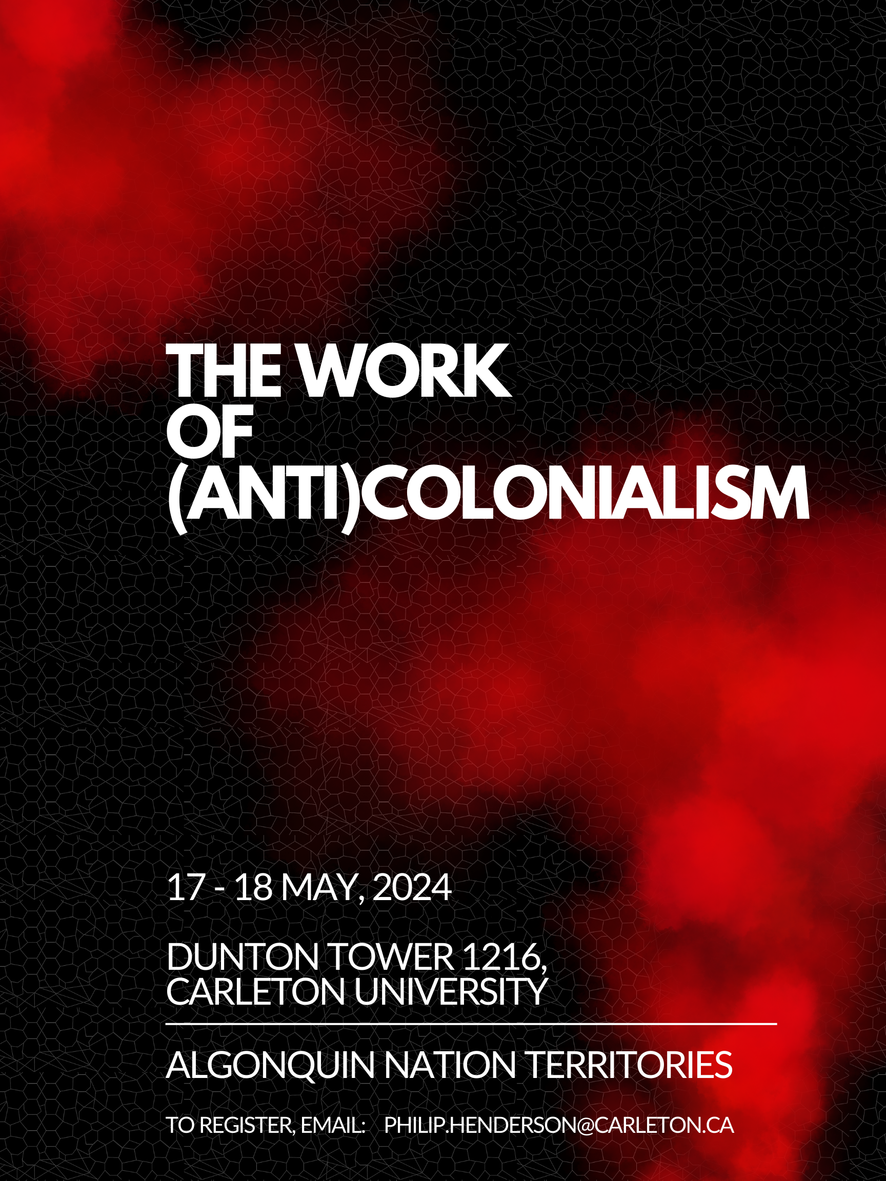 “The Work of (Anti)Colonialism” is a two-day SSHRC-funded colloquium that is being hosted at Carleton University on Friday May 17th and Saturday May 18th. Drawing together thirteen scholars from across Canada and the United States, it will open a sustained dialogue on the past, present, and future of tensions and solidarities between organized labour and Indigenous-led anti-colonial struggle in what is presently known as Canada. Participating scholars bring a range of expertise from across a number of disciplinary backgrounds, social locations, and levels of seniority within the academy.